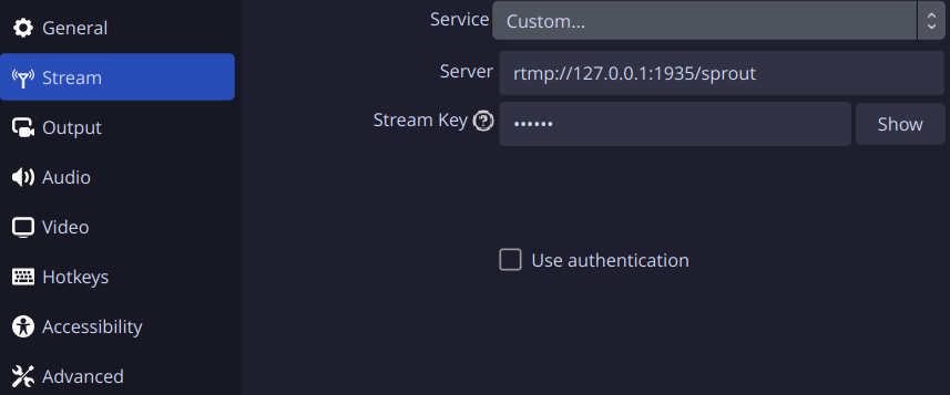 • rtmp://127.0.0.1:1935/sprout (default)