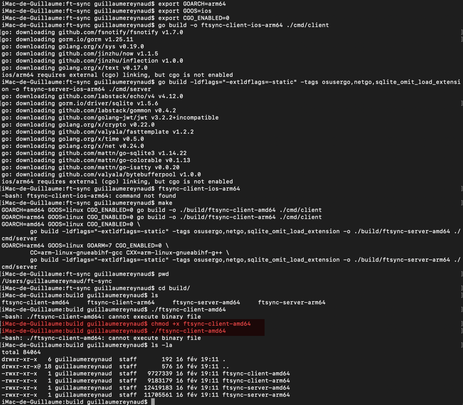 je viens d'exécuter les commandes ci-dessus, ensuite j'ai fait un make, un répertoire buils a été créé avec les fichiers dedans mais lorsque j'essaie d'exécuter le client j'ai toujours le message : -bash: ./ftsync-client-amd64: cannot execute binary file